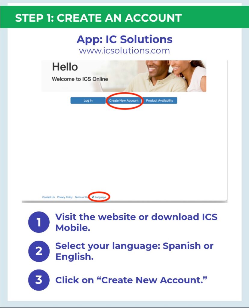 Ve al sitio web o abre la app. Selecciona tu idioma: inglés o español. Haz clic en “Create New Account”.